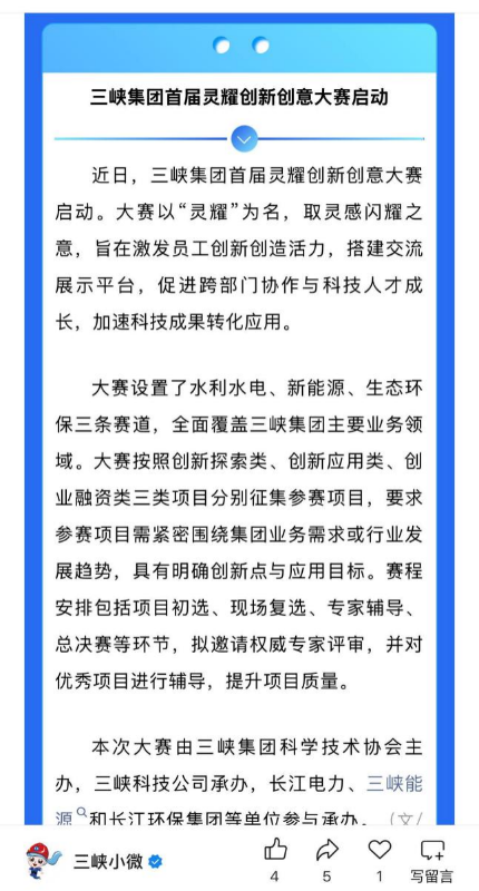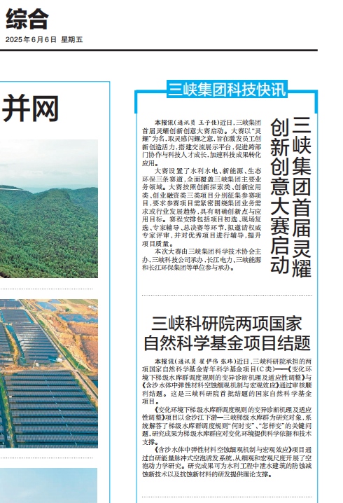 為深入學習貫徹習近平總書記關于科技創(chuàng)新的重要論述精神,貫徹落實創(chuàng)新驅動發(fā)展戰(zhàn)略,激發(fā)全集團員工創(chuàng)新創(chuàng)造活力,促進科技成果應用轉化,引領推動集團公司高質量發(fā)展,集團公司首屆靈耀創(chuàng)新創(chuàng)意大賽(以下簡稱靈耀大賽)已于5月23日正式啟動。本次大賽由三峽集團科協(xié)主辦,三峽科技主承辦。首屆靈耀大賽啟動得到了集團各媒體平臺的關注和報道。