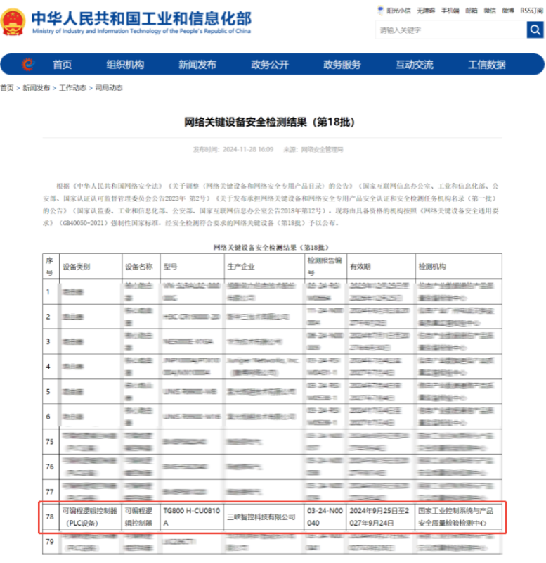 近日,三峽科技有限責(zé)任公司(簡稱三峽科技)下屬三峽智控科技有限公司(簡稱三峽智控)TG800大型智能控制器產(chǎn)品,正式在工信部網(wǎng)絡(luò)關(guān)鍵設(shè)備安全檢查結(jié)果目錄(第18...【詳細(xì)】